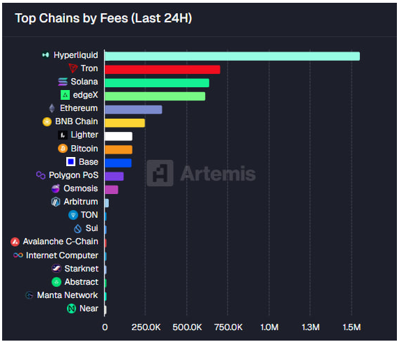 昨天,Hyperliquid 所产生的交易费用比以太坊还要多——24 小时内达到了 160 万美元。阿特米斯公司提供的最新数据显示,2026 年 3 月 3 日,Hyperliquid 在 24 小时内产生的交易费用总额达到 160 万美元,超过了以太坊、波场和索拉纳等其他区块链,其产生的费用是排名第二的区块链的两倍多。 “阿特米斯顶级链按费用计算的图表2026-03-03 22:09:46 -