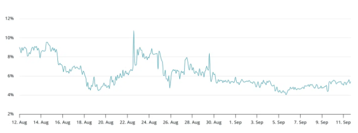 衍生品市场显示,与目前的现货价格相比,ETH期货交易溢价5%。这种差异表明,保证金交易员的活动受到了限制。标准的市场条件通常维持5-10%的期货溢价,以补偿延长的结算期。8月份金价突破4,800美元,同样未能在市场参与者中产生持久的看涨势头。