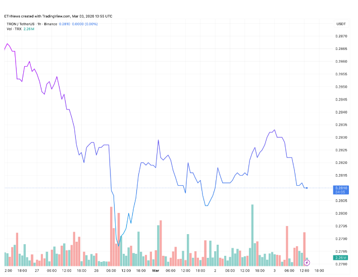 2026 年 3 月 3 日,TRX/USDT 的交易价格为 0.2810 美元,此前未能守住上升通道之上,并在跌破下降阻力线后遭到打压,分析师认为 0.27 美元为突破点,0.2950 美元为无效点。