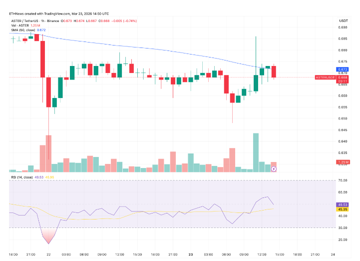 在撰写本文时,ASTER 在一小时图表上的交易价格为 0.669 美元,较前一小时下跌了 0.59%。涵盖 3 月 21 日至 3 月 23 日下午的图表完整展示了这两日的走势。该图表显示了价格在周六开盘时高于 0.685 美元,随后由于大盘的大幅下跌,其在同一天的交易时段内跌至接近 0.655 美元的低点,这一低点也触及了所有主要资产的价格。随后的价格回升一直持续到周日,并延续至周一上午,使 ASTER 重新回到 0.670 至 0.675 美元的区间内,在过去 36 个小时里,它一直在该区间内进行盘整。