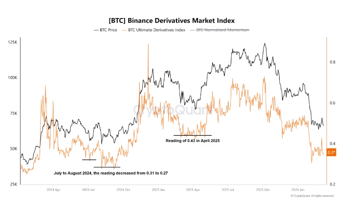 两个比特币指标正处于此前重大反弹之前的水平位置上分析师阿姆尔·塔哈编制的两款独立的 CryptoQuant 指标同时显示出了具有历史意义的读数,这些读数通常出现在比特币市场的重要底部附近。但这两者都不能保证会再次出现这种情况。不过,两者都值得我们去了解。 衍生品指数解读 币安衍生品市场指数是衡量币安平台2026-03-09 21:53:16 -