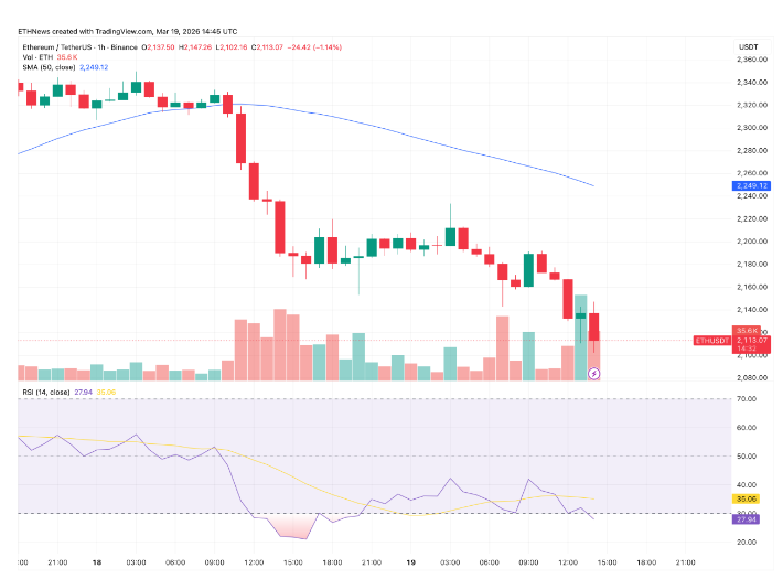 那次反弹未能成功。从 3 月 19 日上午开始,价格持续走低,从 2200 美元逐渐降至 2160 美元,随后在 3 月 19 日下午早些时候大幅下跌,图表右侧出现了可见的最长红色柱体。该交易时段的最低价触及 2102 美元,随后在收盘时部分回升至 2113 美元。当前的交易量为每小时 35600 个以太币,最近的柱形显示了图表右侧的最大成交量峰值。50 日移动平均线位于 2249 美元,比当前价格向下倾斜 6.4%。