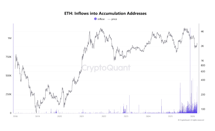 流入图表所呈现的内容更为直观地反映了相关情况。以太币流入到积累地址的数量大幅增加,达到了自 2018 年以来图表上所能看到的最高水平之一,而在最近这段时间,蓝色的流入柱状图甚至接近了 100 万以太币的区间。