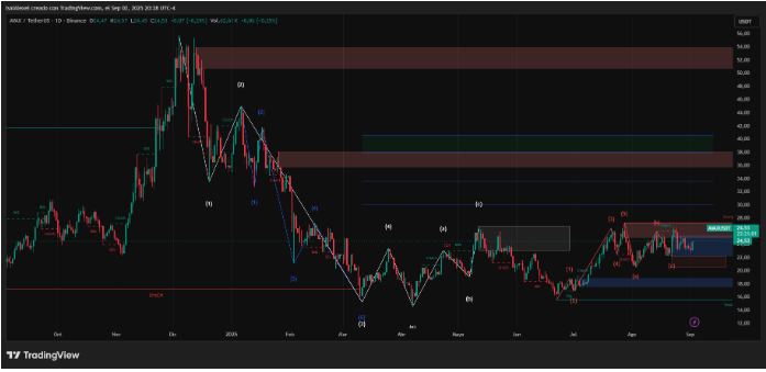 三链架构分离了x链资产、c链EVM合约和p链验证器,目标是吞吐量、可扩展性和企业级部署能力。分析师们列举了看涨三角形、ETF在24.8美元上方的投机阻力、大量积累以及币安、HTX和Bybit的流动性。