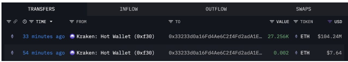 区块链数据显示,在过去的几个小时里,BitMine从Kraken热钱包购买了价值1.042亿美元的ETH,大约27,256 ETH。大量资金流入凸显了机构对以太坊长期前景的信心日益增强,尽管以太坊价格在此前跌破3500美元后徘徊在3760美元附近。