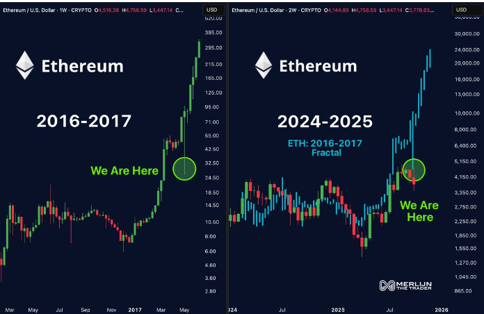 交易员Merlijn The Trader发布了一份令人信服的图表,比较了以太坊2016-2017年的牛市和目前的2024-2025年周期,表明市场可能处于类似的反弹前阶段。在上一个周期中,以太坊不仅上涨,而且“改写了市场历史”,在几个月内飙升超过1000%。当前的分形显示ETH定位为类似的抛物线阶段,如果模式重复。