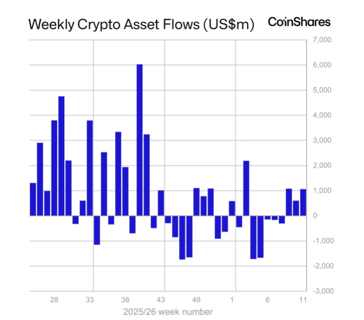 加密基金延续三周涨势,尽管面临地缘政治压力仍获得 10 亿美元资金流入