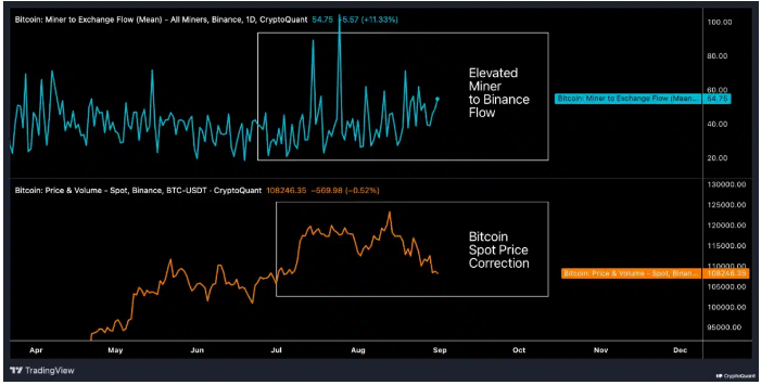 根据最近的流量数据,从矿工到交易所(尤其是币安)的转账在8月底有所上升。当矿商增加外汇存款时,可供出售的供应就会增加。在8月中旬创出历史新高后,金价在9月初回落约13%,至108,700美元左右,与获利回吐和矿商平仓相符。