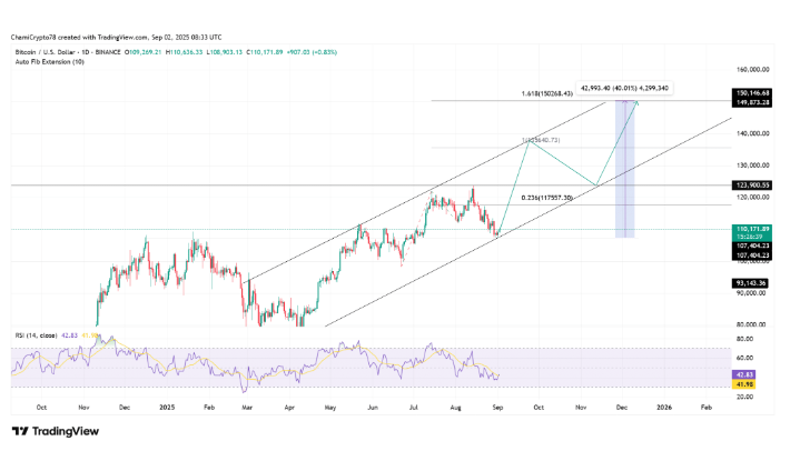 来自斐波那契映射的扩展目标接近15万美元。然而,如果失去通道支撑,将首先暴露10.4万美元,如果压力持续,将暴露9.3万美元区域。简而言之,下一个冲动取决于买家是否继续捍卫通道的基础——比特币目前的“底线”。