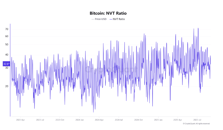 RSI在42.8附近显示出疲弱但趋稳的趋势能量,若需求扩大则有改善空间。在链上,网络价值与交易(NVT)比率下降了17.35%,至32.6,表明市场价值与结算活动更接近。从历史上看,当网络使用支持估值时,NVT打印量的下降伴随着更健康的阶段。
