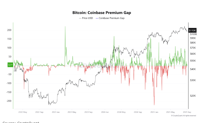比特币从历史高点回落12.8%,符合持续上涨趋势的常见回调范围。在强劲的周期中,10%-18%的跌幅通常标志着盘整而不是崩溃,而更深的跌幅往往接近30%。在从107,000美元区域反弹后,价格徘徊在110,000美元附近,磁带仍然显示出修正,而不是投降。