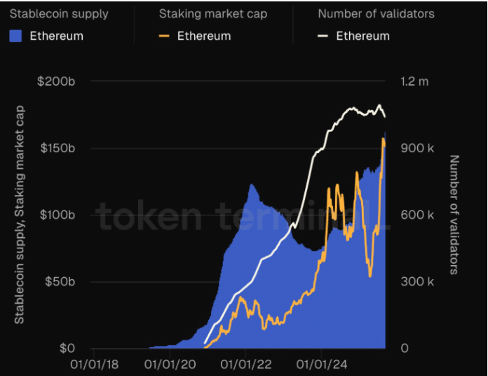 网络数据表明有可能增加机构参与。稳定币里程碑伴随着另一个重要的网络指标。以太坊目前在全球分布着大约110万个验证器。这种广泛的验证器网络增强了安全性和分散性。
