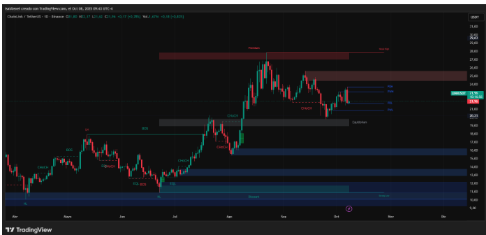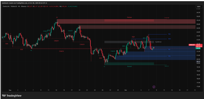 Chainlink助力EcoYield ESG回报;主要金融机构采用CCIP推动了代币化资产的互操作性和合规性集成。近期支撑位21.50美元;在21.40美元下方无效将有利于空头,促使重新评估风险管理头寸规模和止损。