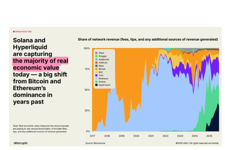 索拉纳的潜在生态系统继续显示出实力。开发商的兴趣很高——根据a16z Crypto最近的一份报告,在过去两年中,建筑商对索拉纳的兴趣增加了78%。与Hyperliquid一起,Solana也占据了大部分经济价值。